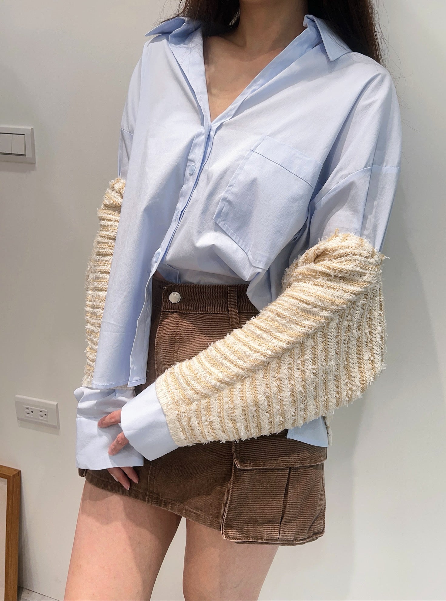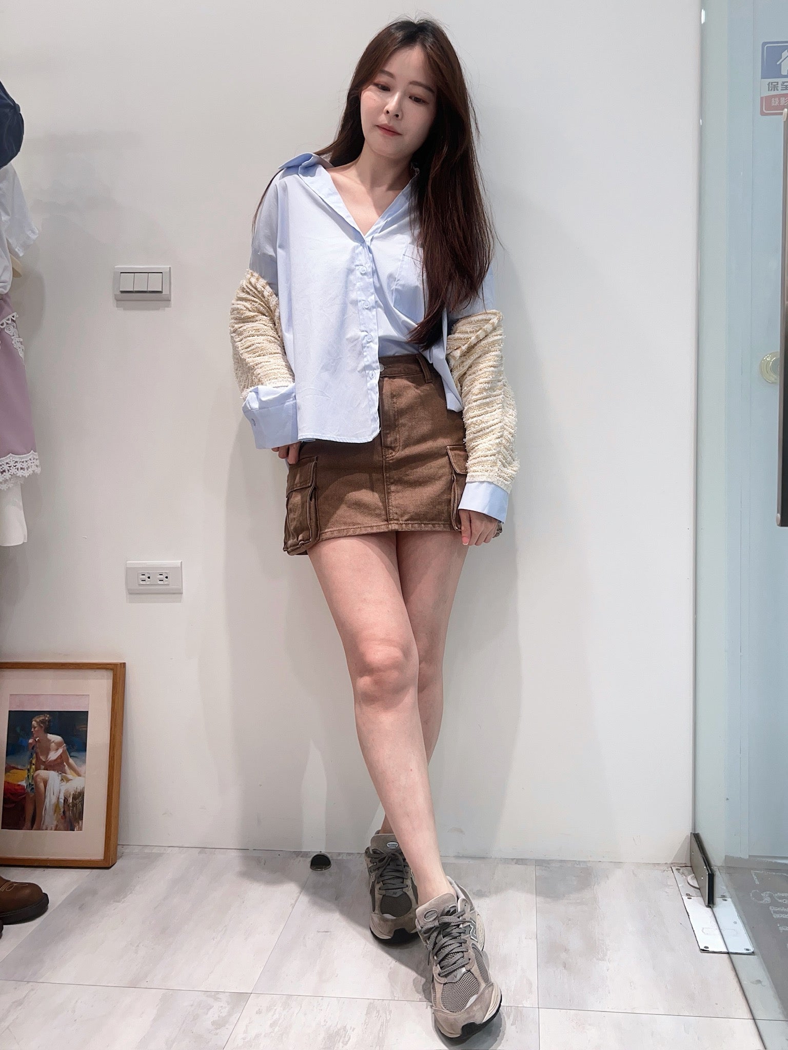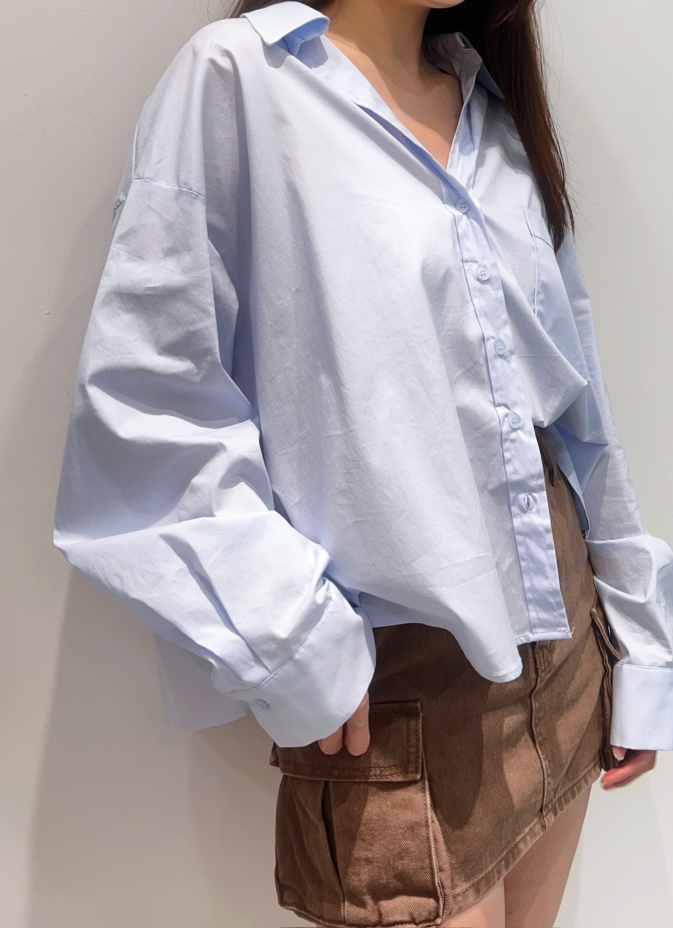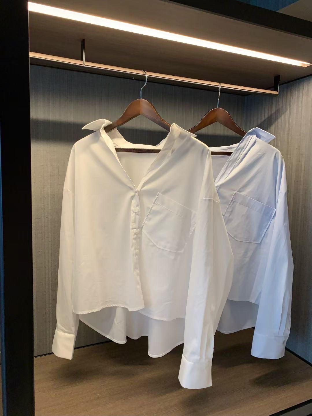 人的氛圍很輕鬆,帶著一點不經意的慵懶感。領口是微開的V字領設計,少了傳統襯衫的拘謹,多了一份自在的空氣感。落肩+寬袖口搭配前短後長的下擺線條,走動時自然帶出層次,也能修飾身形比例。胸前的大口袋是低調的小亮點,讓簡單中不失設計感