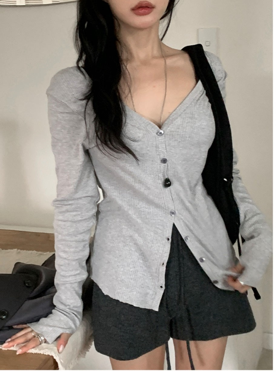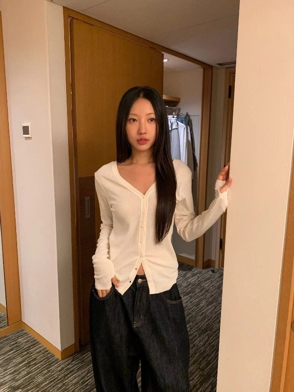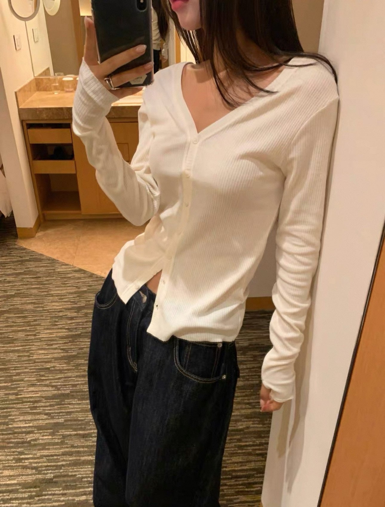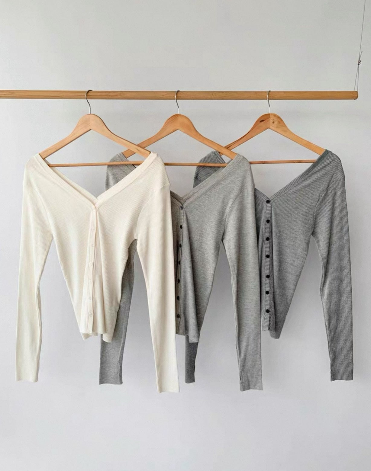 前後深V設計,前面是排釦小心機,後面則是俐落的縫線延伸,讓整件看似簡單卻帶著隱約的性感。布料貼身卻不緊繃,穿起來帶一點隨性慵懶感。
