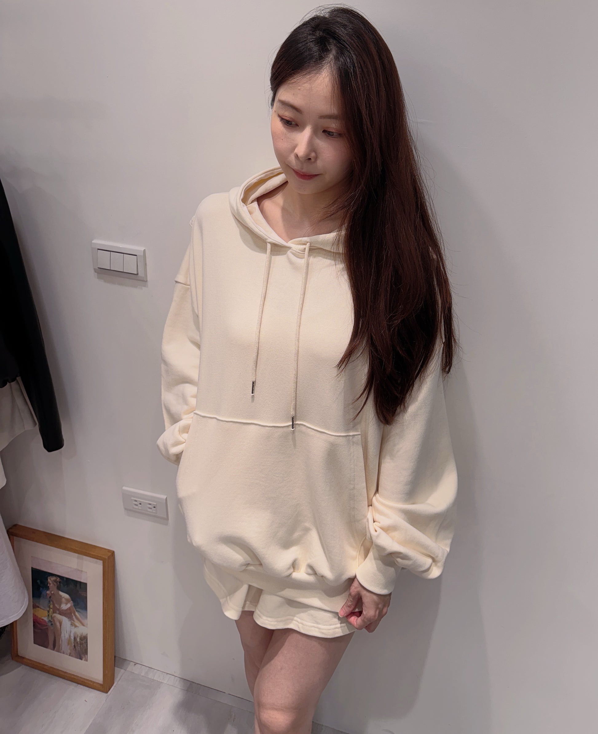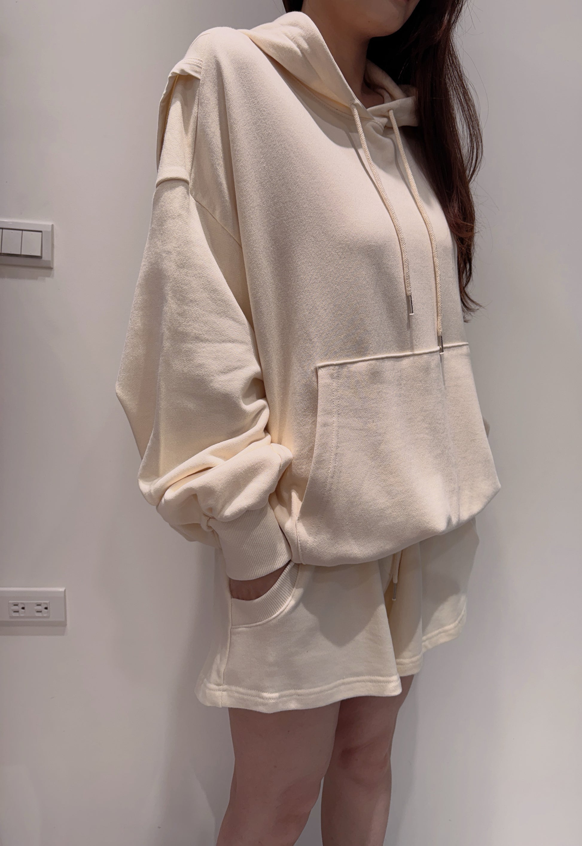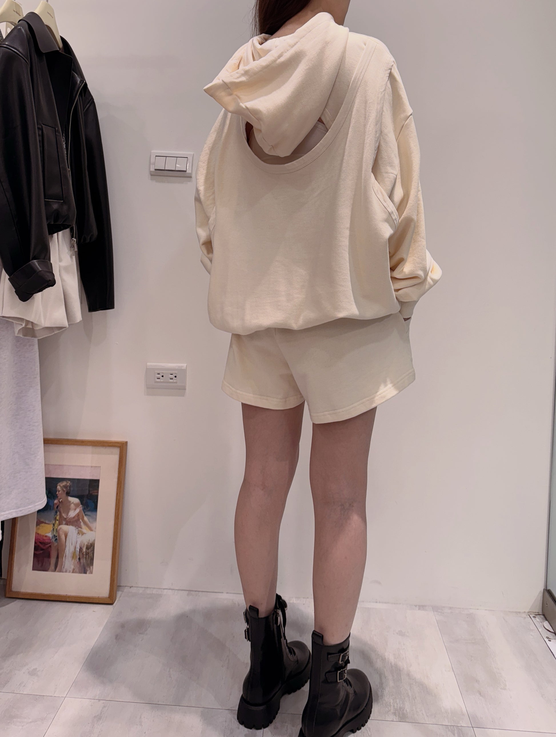 上衣是微寬鬆版的連帽設計,後背挖空細節讓層次與呼吸感並存,不論單穿或內搭背心都能展現俐落的隨性氣質。