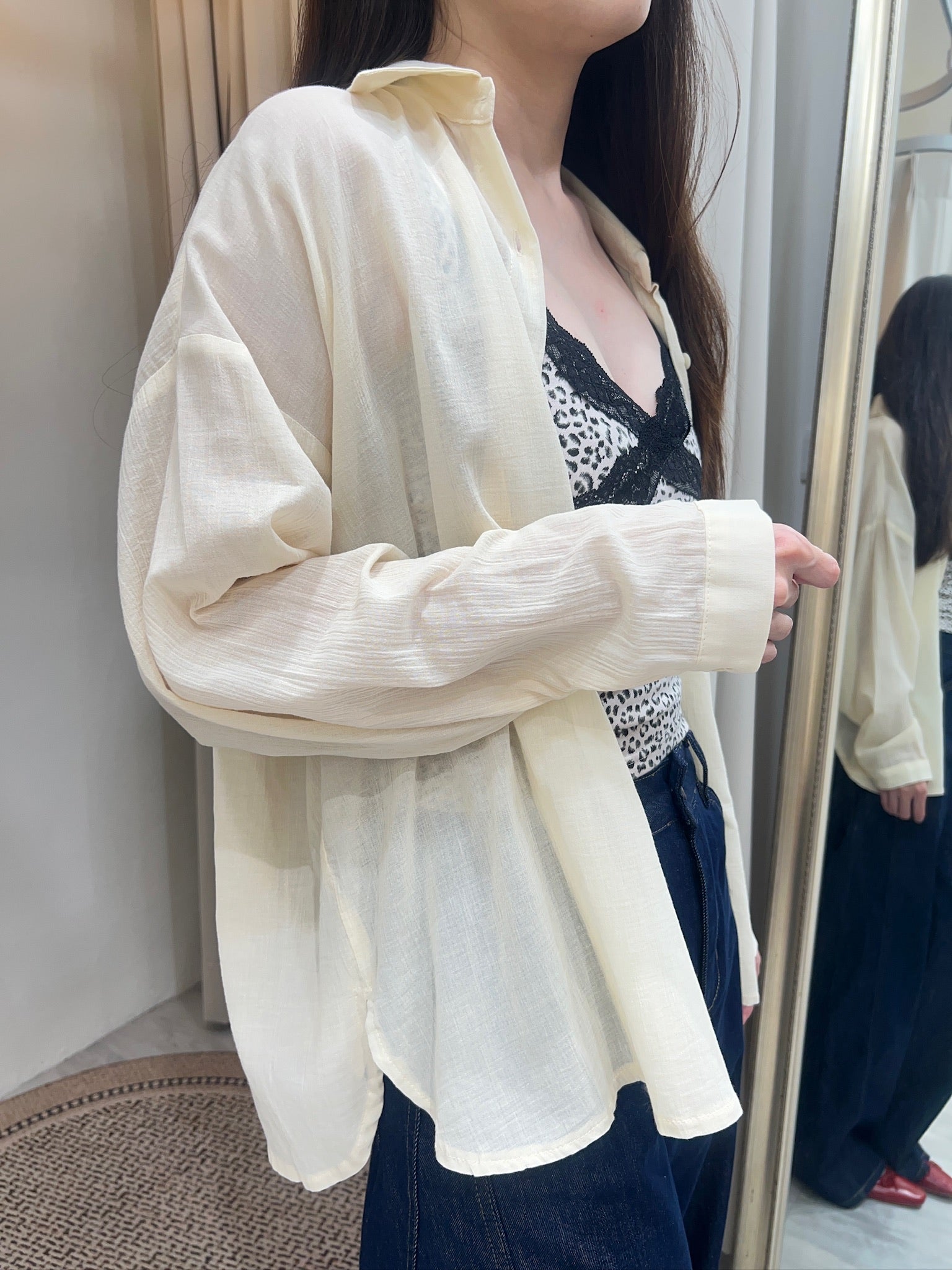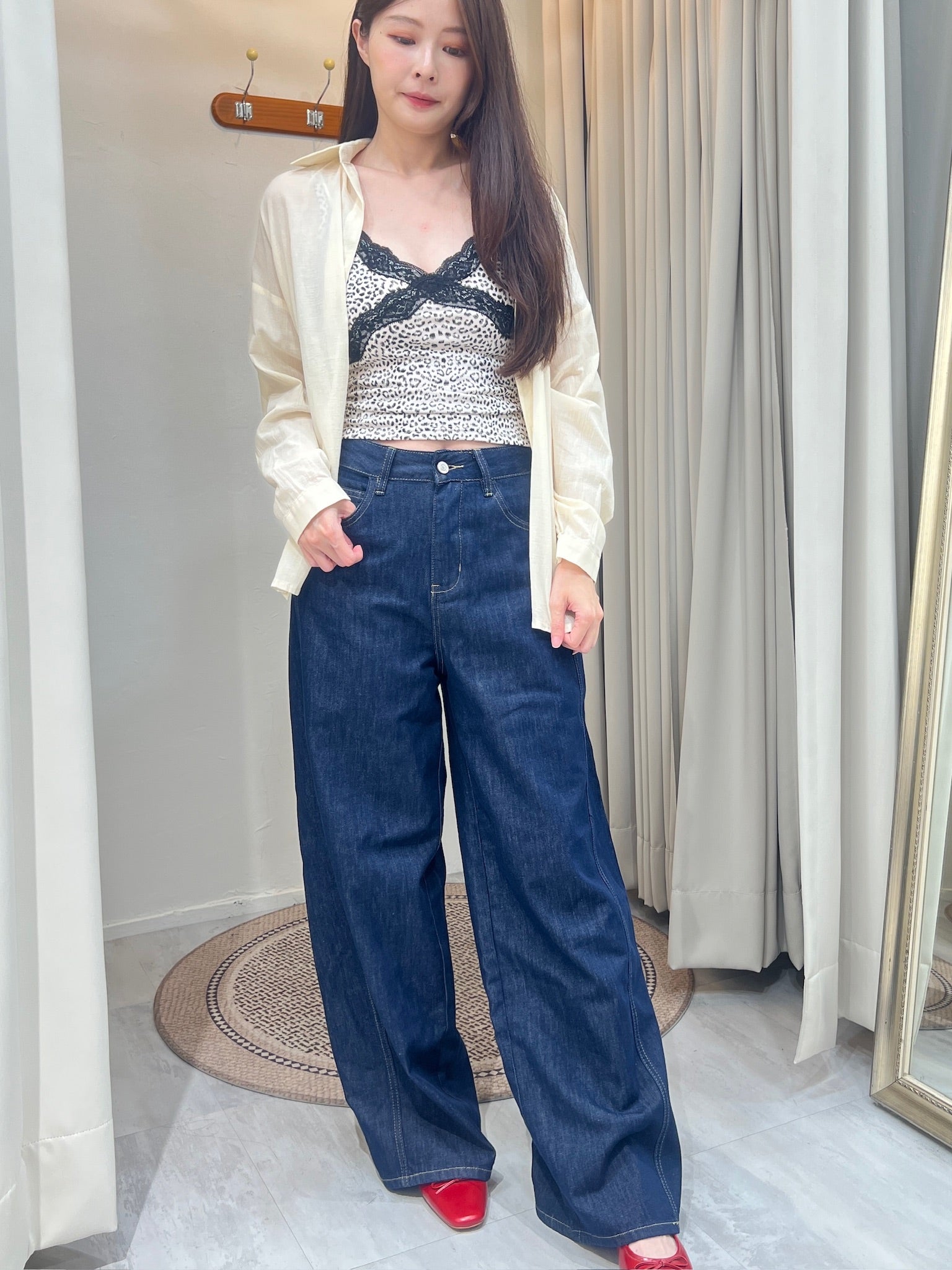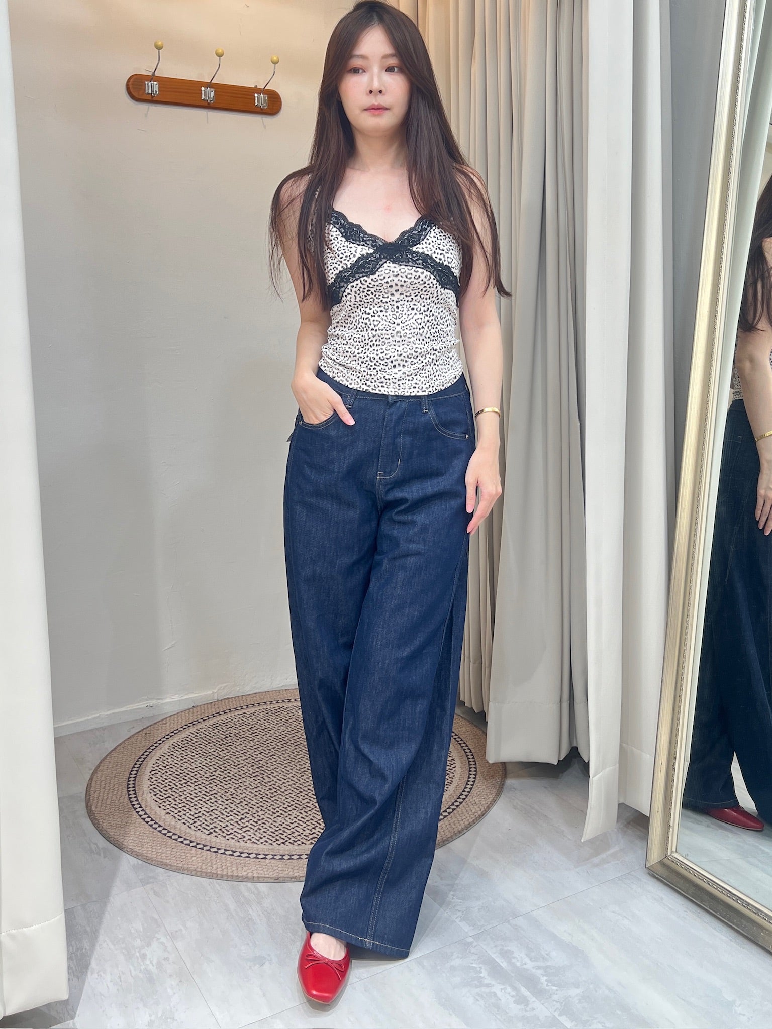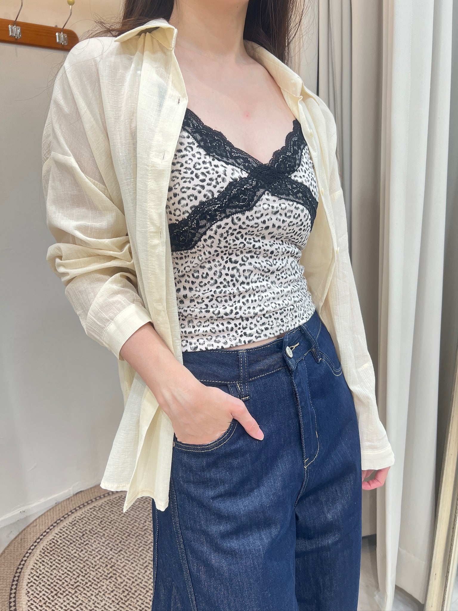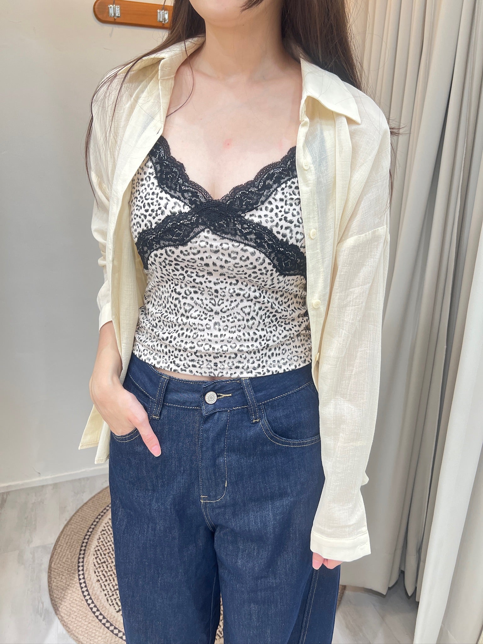 一件帶點小性感的豹紋蕾絲細肩背心,輕盈布料勾勒出俐落線條,黑色蕾絲交叉設計像是一道柔軟卻有力量的標記,讓日常穿搭多了一點叛逆的女人味