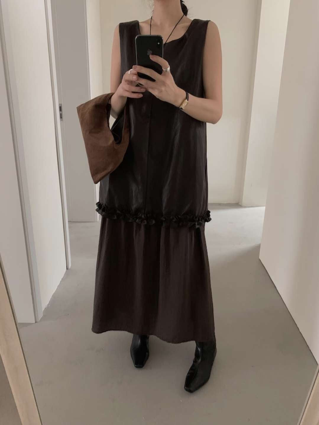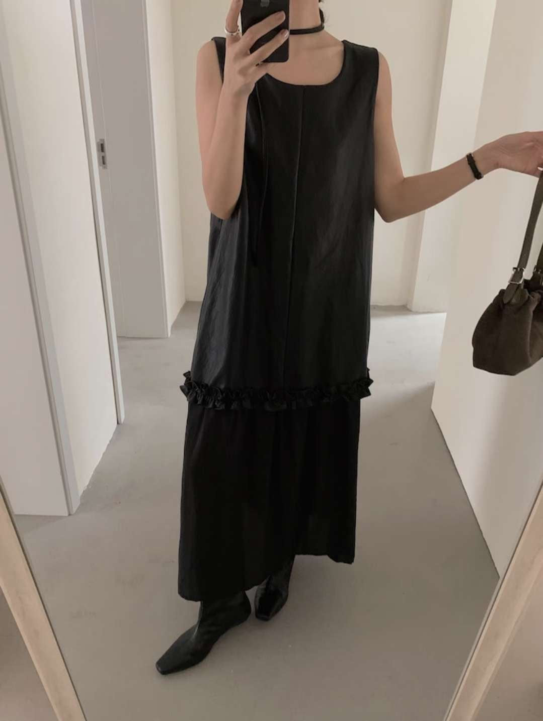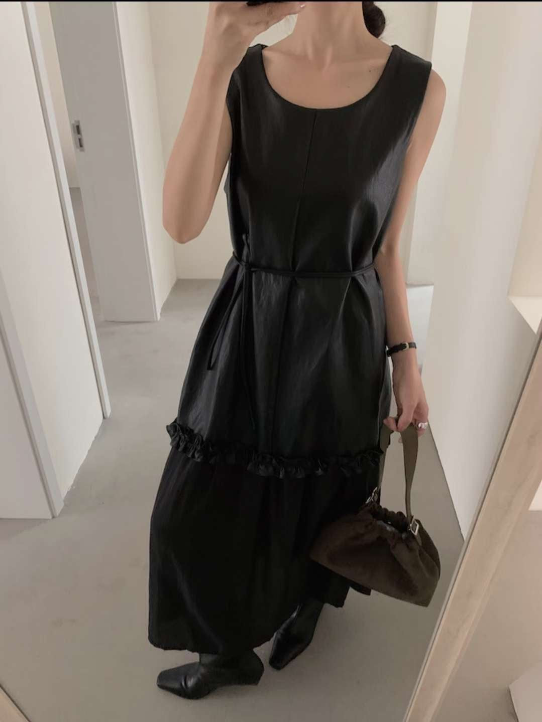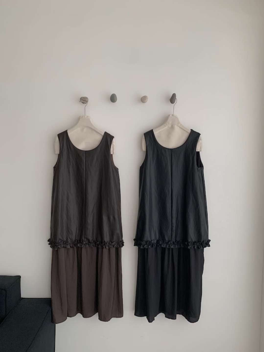 無袖寬鬆剪裁,腰間以細緻皺褶裝飾,讓整體不會過於單調,搭配輕微光澤的布料,穿起來帶點文藝的氛圍。咖啡色沈穩內斂,黑色則更俐落