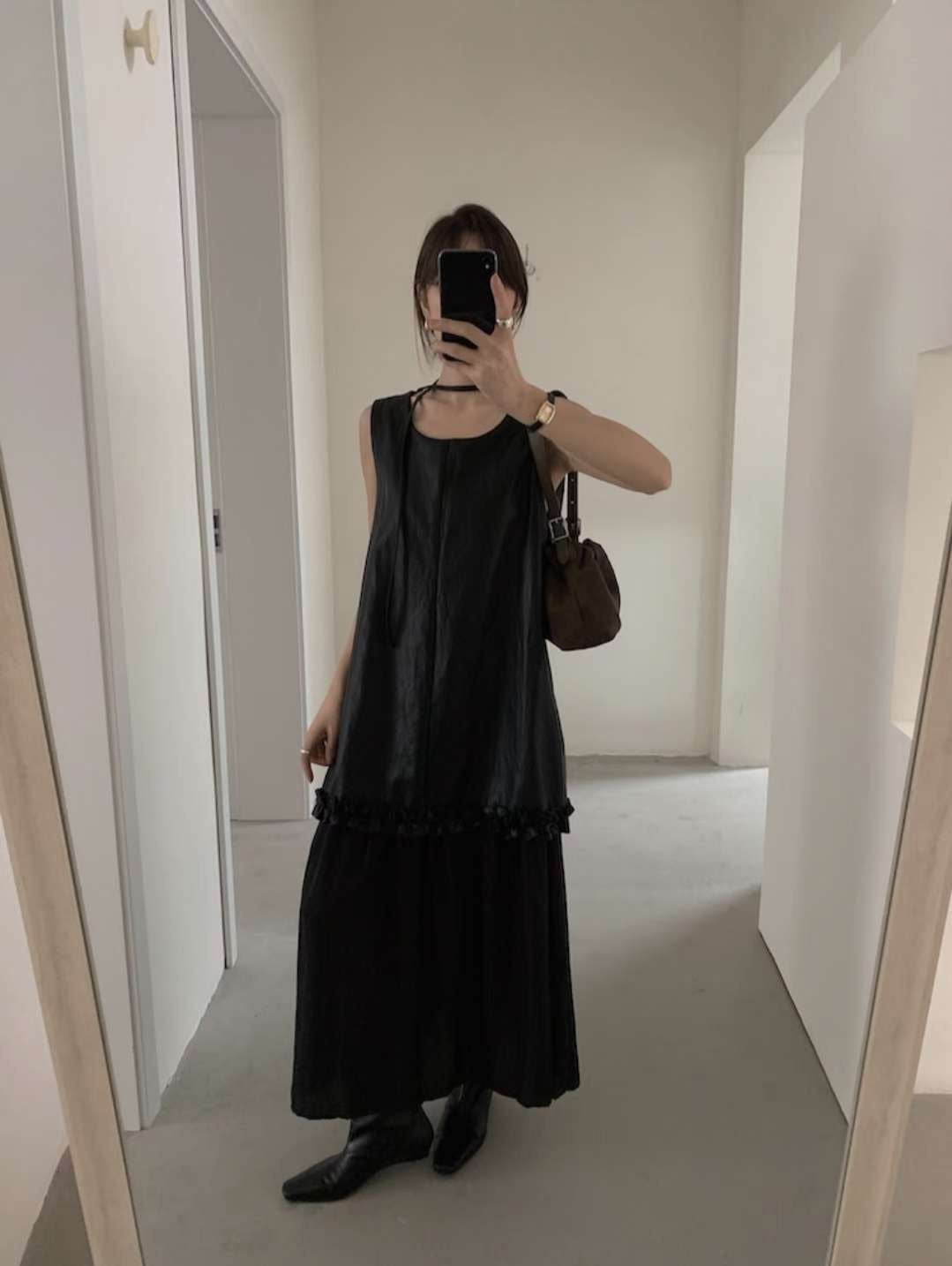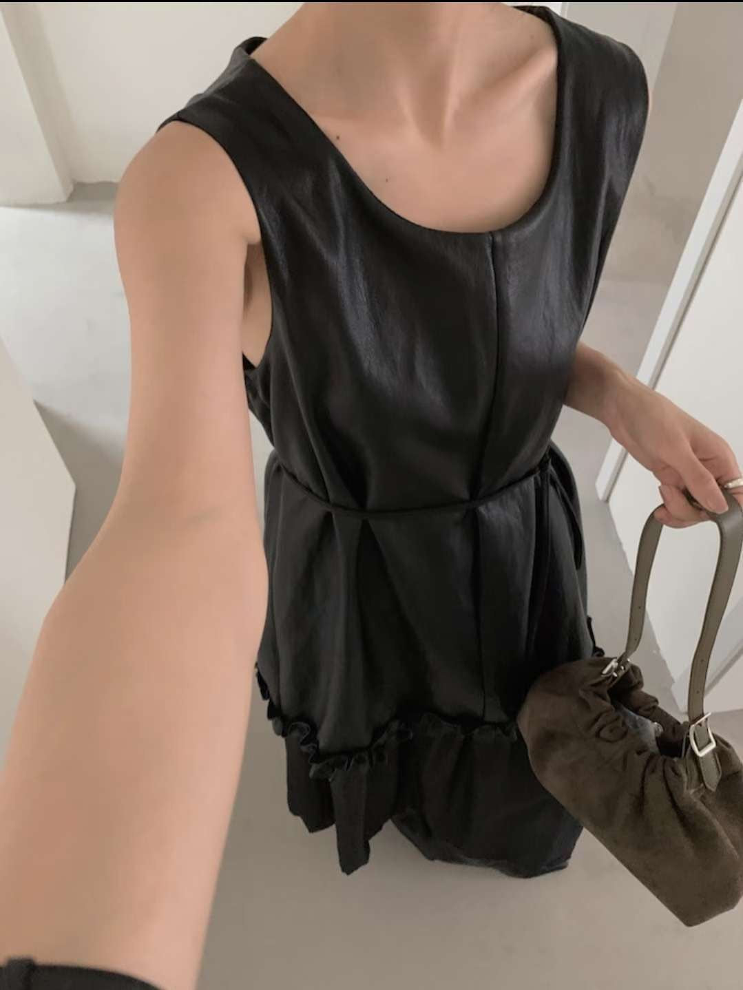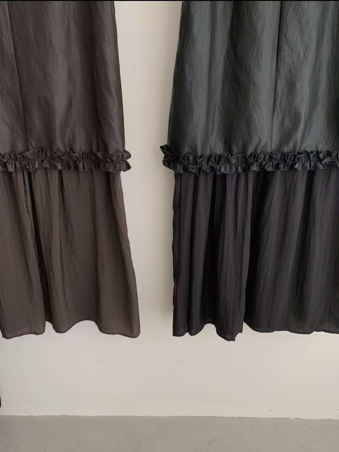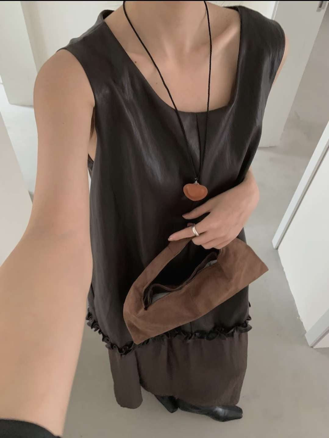 無袖寬鬆剪裁,腰間以細緻皺褶裝飾,讓整體不會過於單調,搭配輕微光澤的布料,穿起來帶點文藝的氛圍。咖啡色沈穩內斂,黑色則更俐落