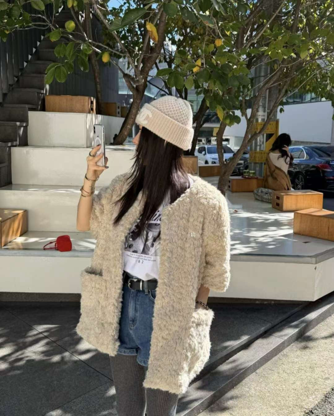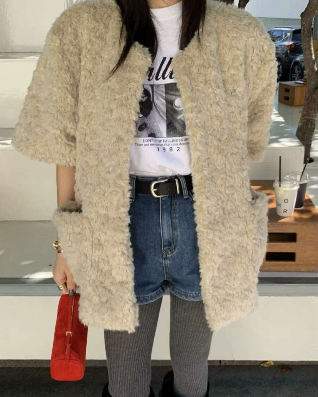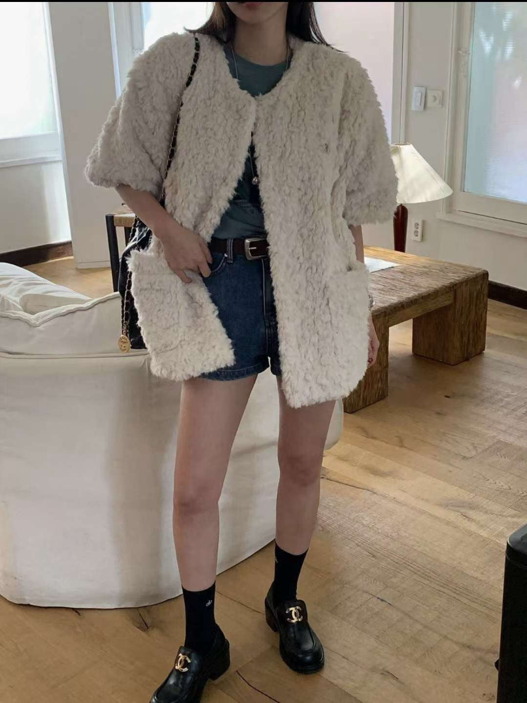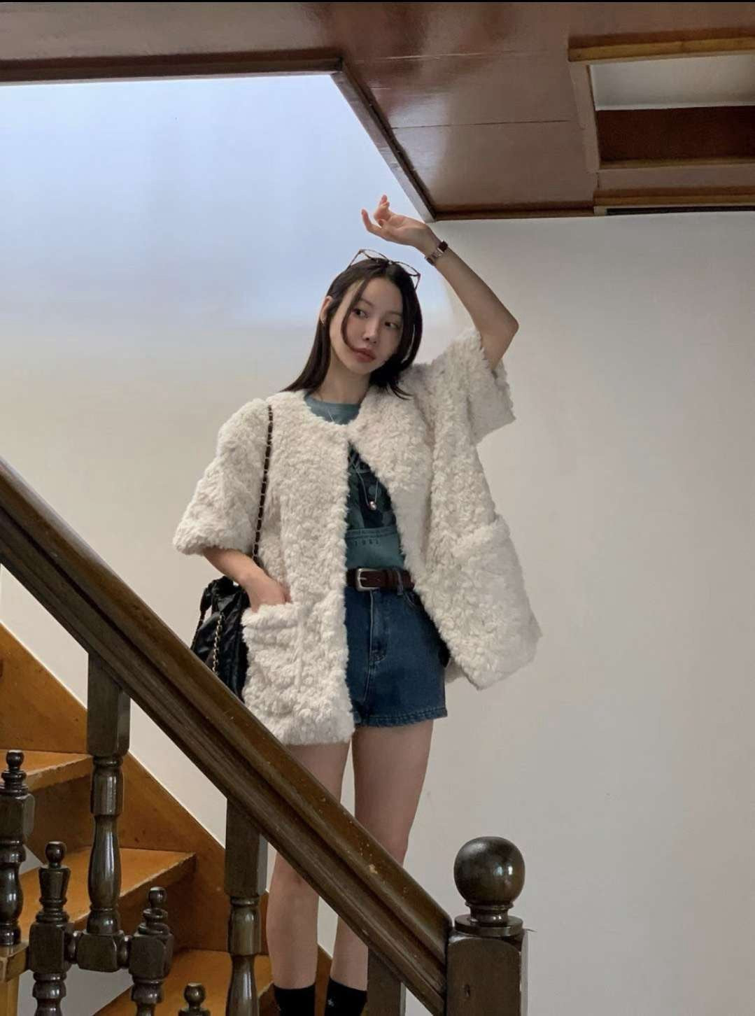 這件泰迪絨短袖外套就是那種輕輕蓬蓬的觸感、穿起來沒有重量,卻能立刻讓整個人變得溫柔起來。