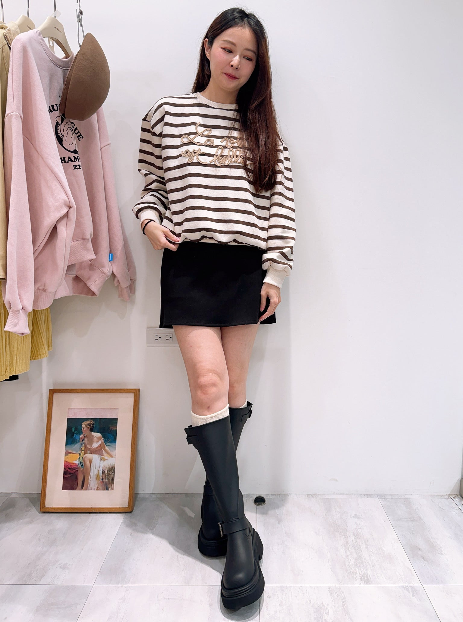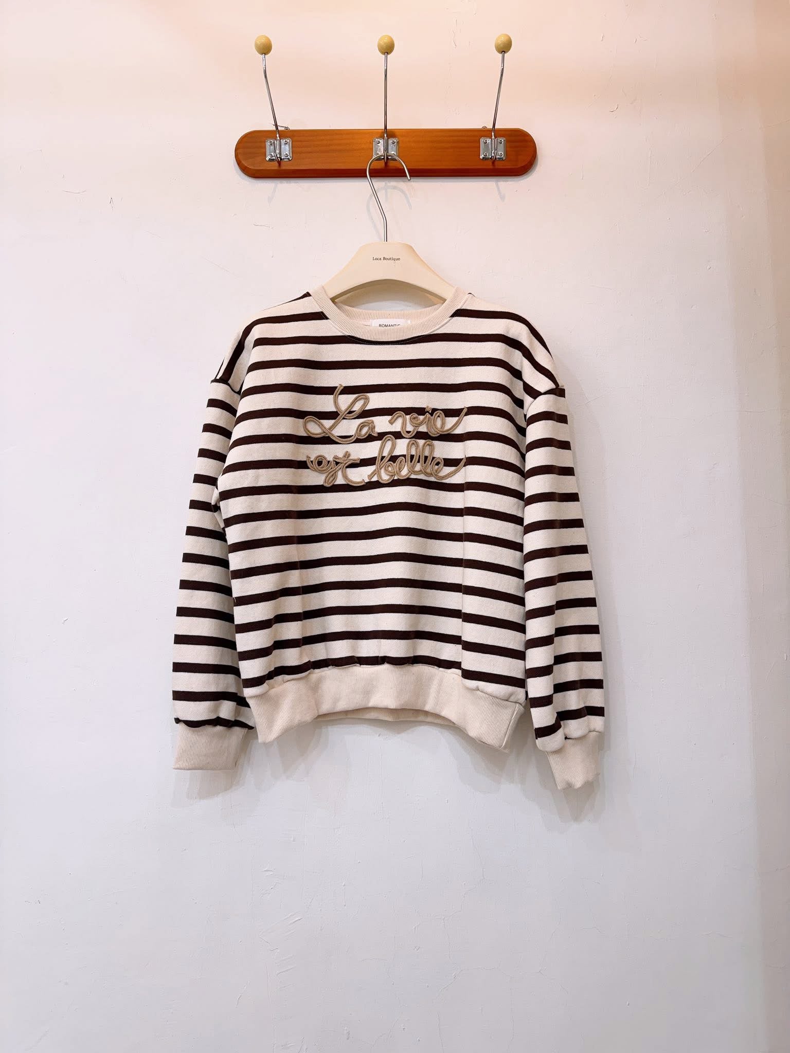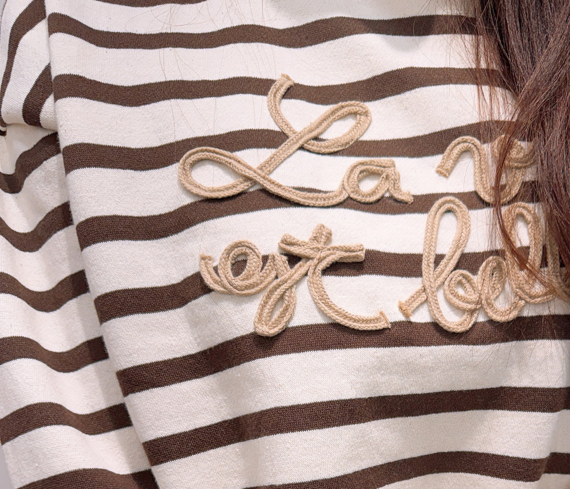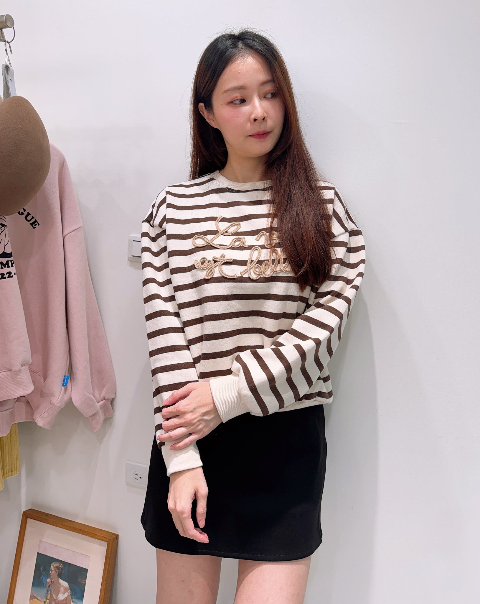 摩卡色的條紋再加上可愛的草寫文字,休閒穿也帶著濃濃的法式氣息,是非常實穿的上衣