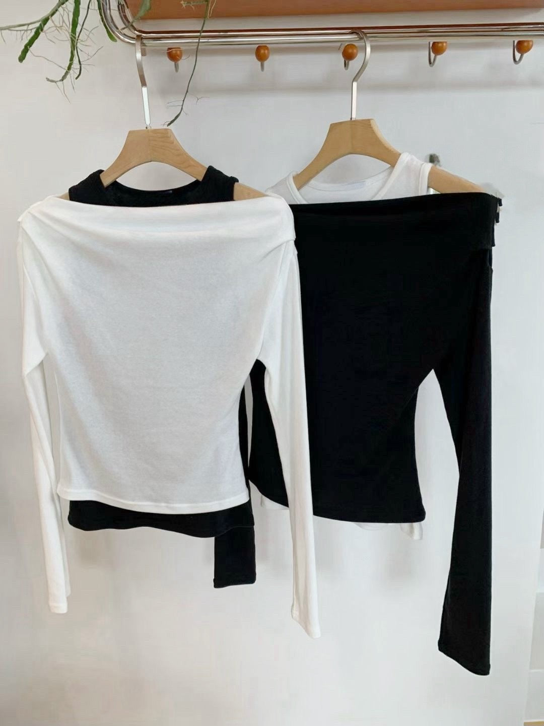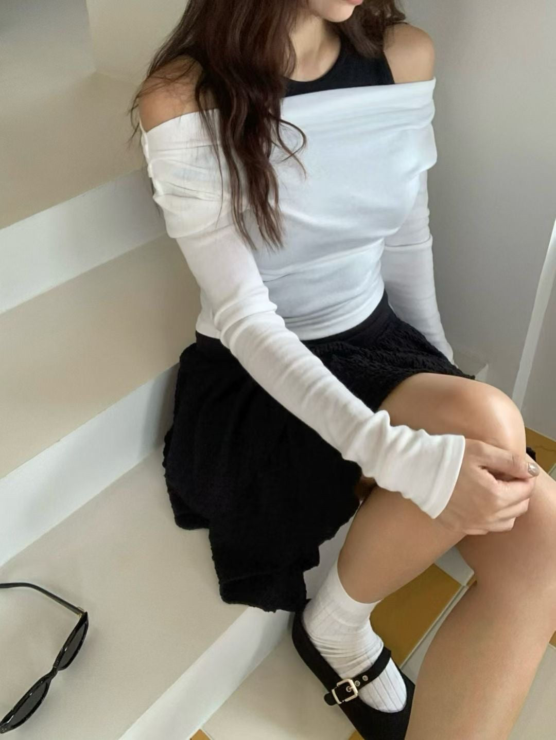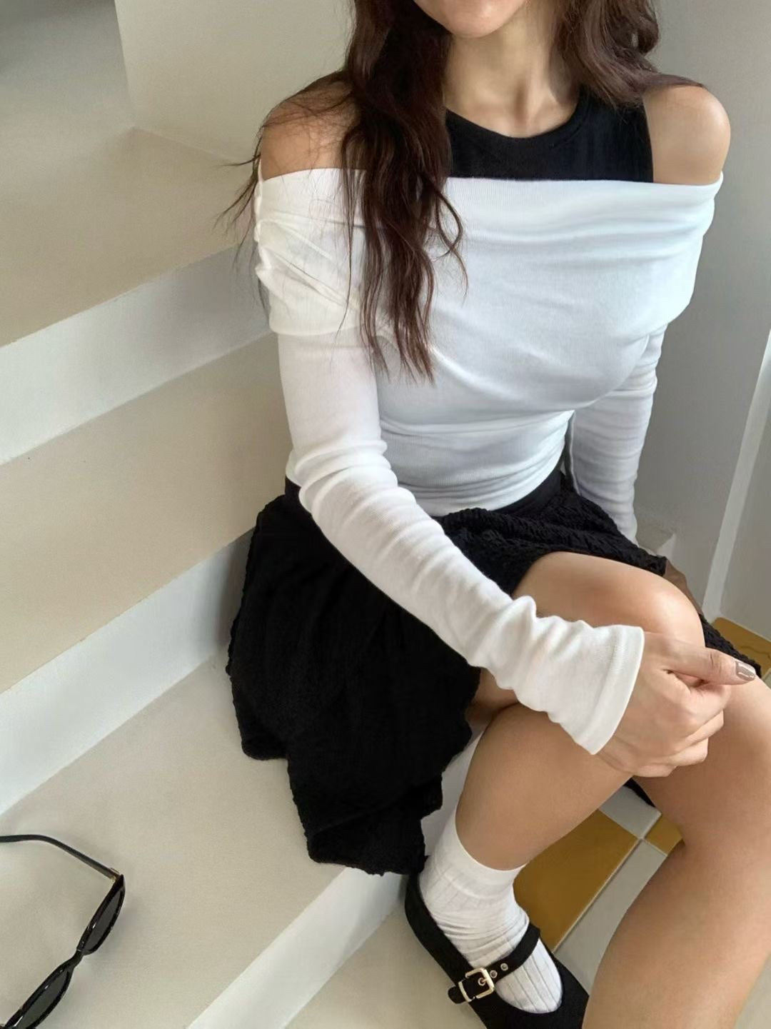 看似一字領的外層,其實拼接了無袖背心的內層,讓肩頸線條若隱若現,帶點微妙的對比氛圍。