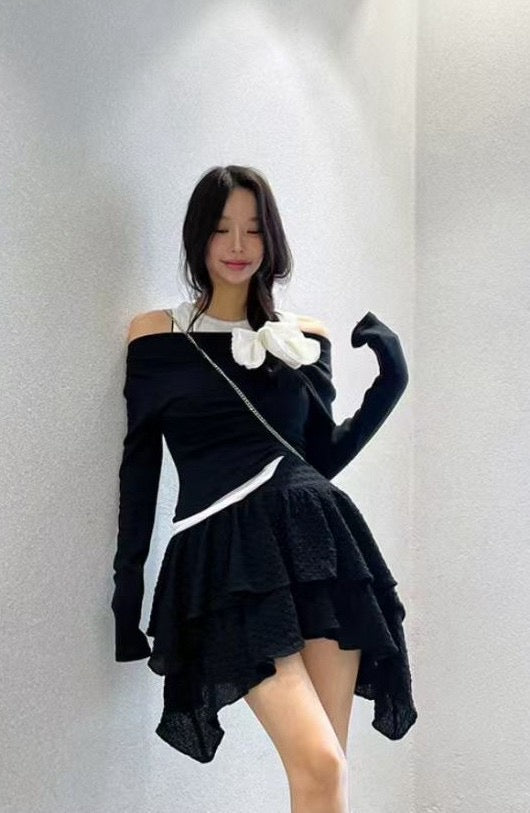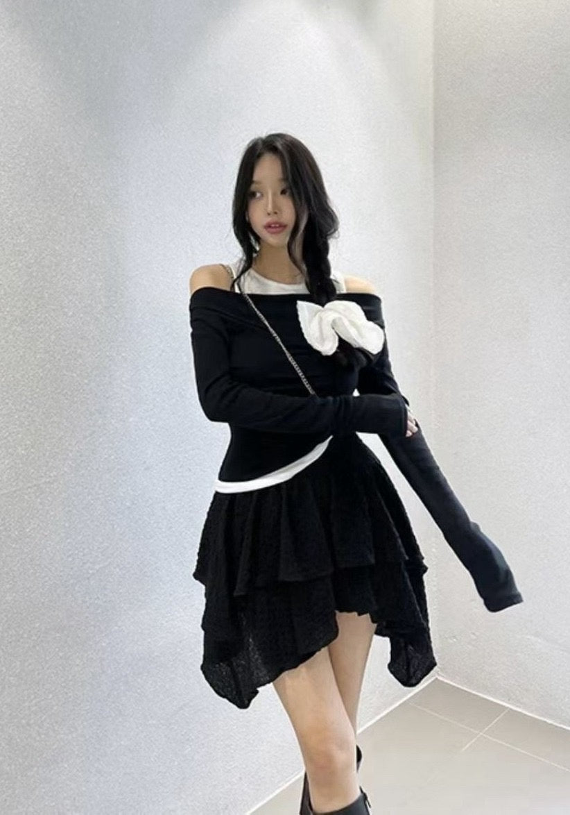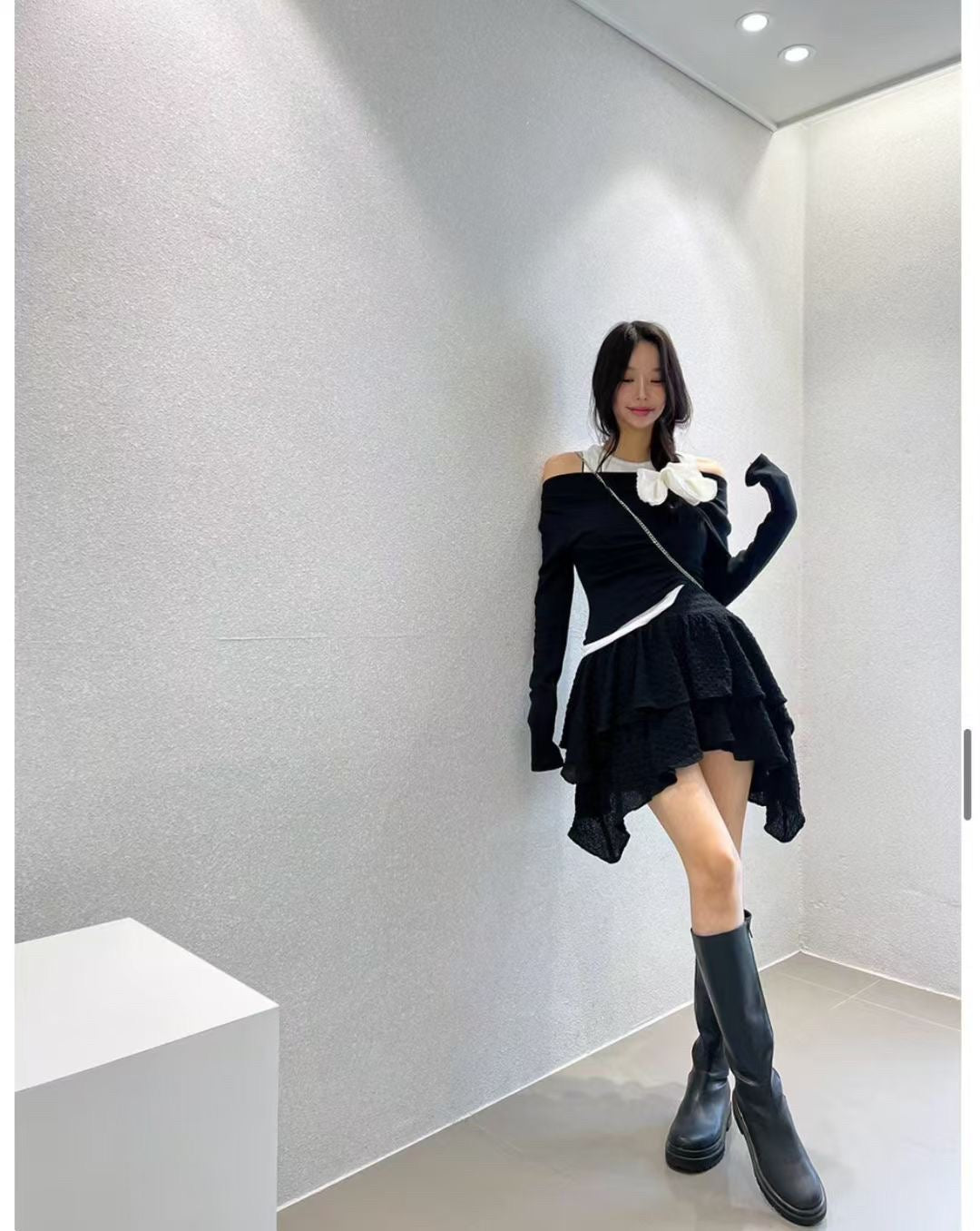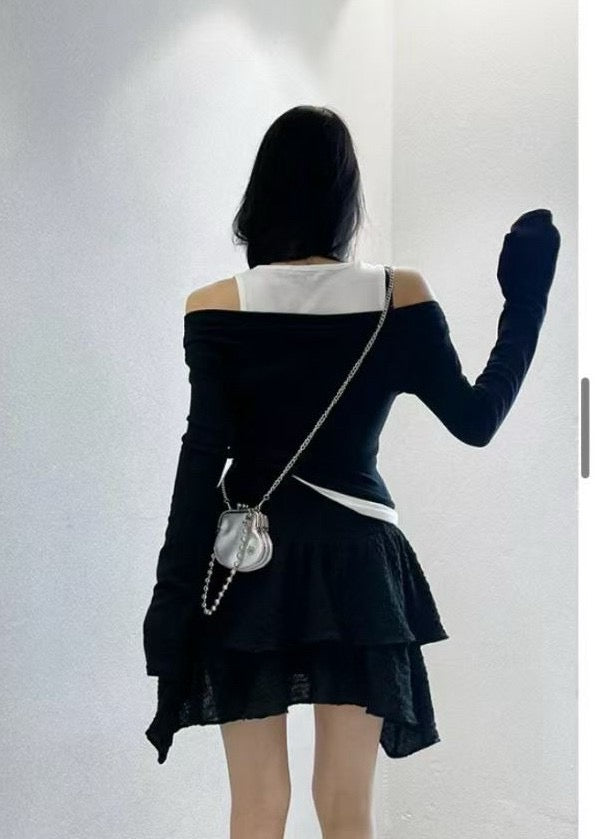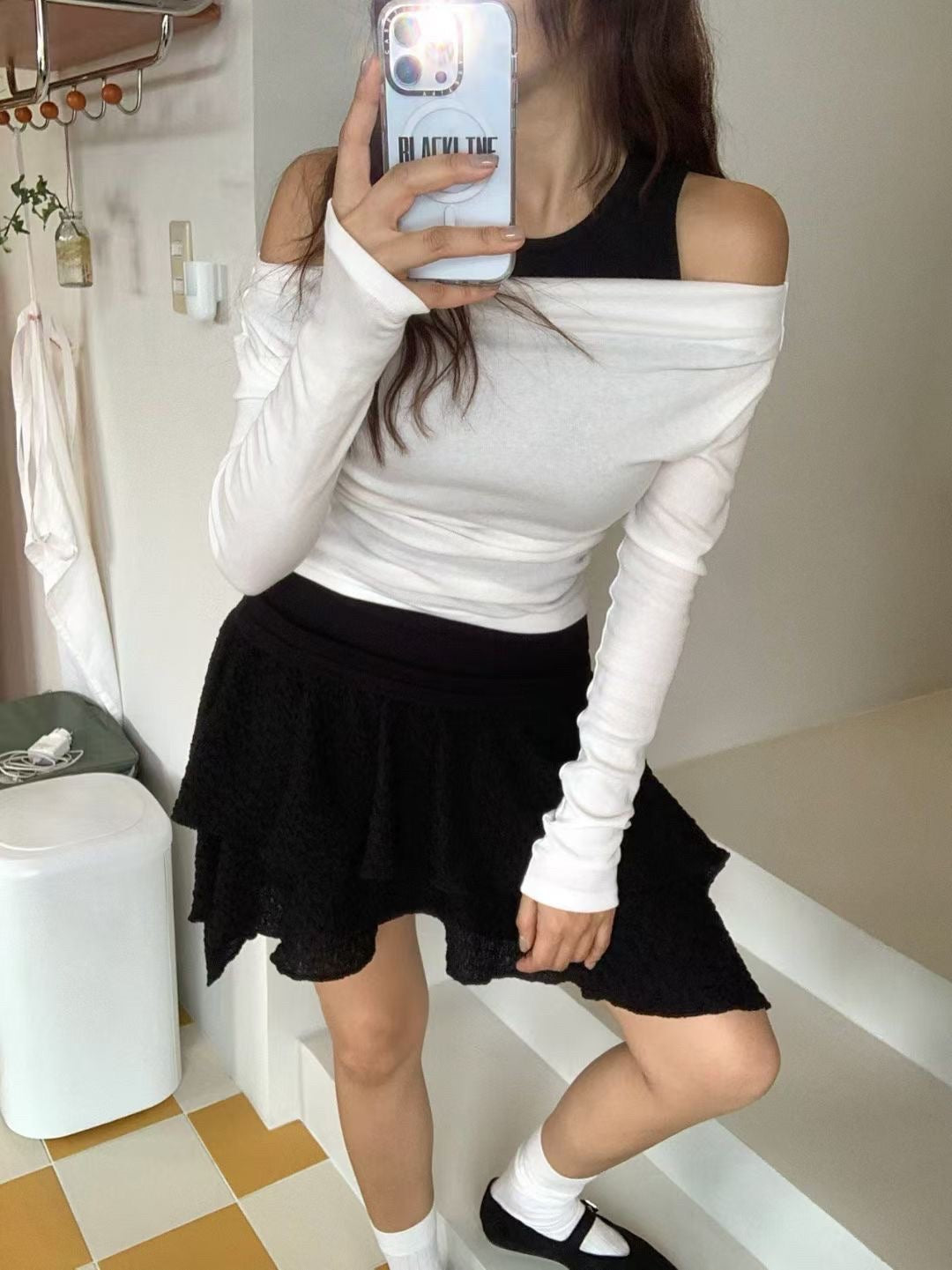 看似一字領的外層,其實拼接了無袖背心的內層,讓肩頸線條若隱若現,帶點微妙的對比氛圍。